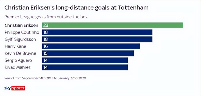 在热刺的巅峰时期,埃里克森不仅做到了这些,还展现了更多——他堪称英超联赛中最出色的创造力源泉。这样的说法看似大胆,但数据足以佐证:在热刺效力期间,这位丹麦中场的助攻数和创造机会数均位居联赛第一,同期禁区外进球数也超过了其他任何英超球员。